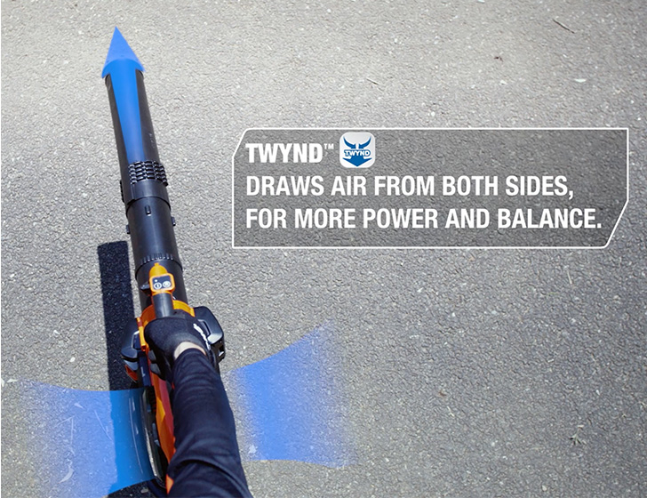 We've called our new dual-intake technology, TWYND. Drawing air from both sides means more power, and the patented symmetrical fan allows the unit to be extremely slimline and compact. TWYND also eliminates gyro-effect, which is the tendency traditional blowers have to rotate towards the operator's leg.